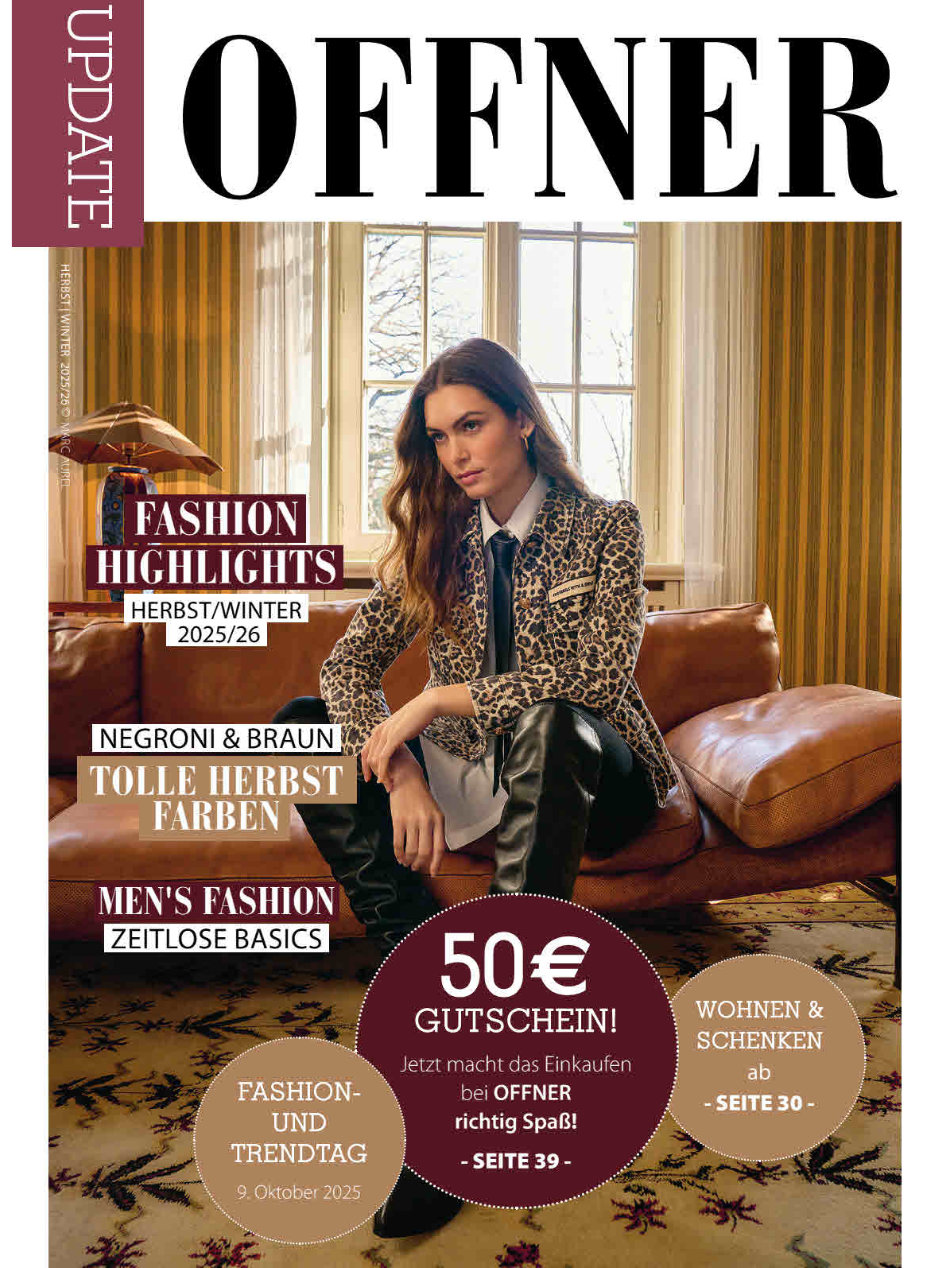 Unser neues Magazin „Update Offner“ ist ein Shopping-Guide der Extraklasse! Auf 39 Seiten zeigen wir die neuesten Trends rund um Mode und Wohnen und mit den Gutscheinen im Magazin macht das Einkaufen bei Offner richtig Spaß! Klicken sie HIER um das Magazin zu öffnen!